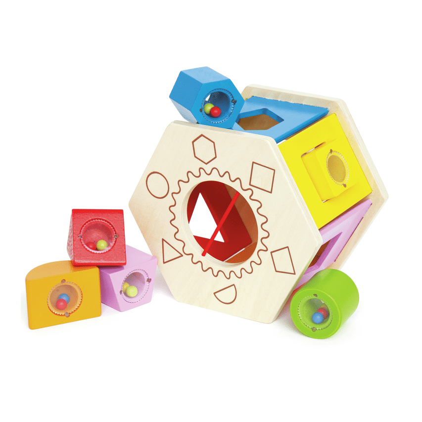 Os blocos, preenchidos com missangas, dão uma nova dimensão ao jogo de formas multitarefa. Encaixe os blocos nas posições corretas e divirta-se com o som deste brinquedo.